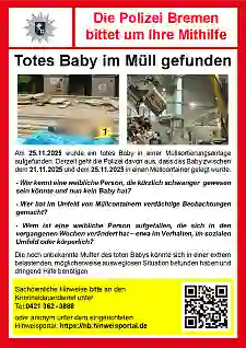 Nachdem vor zwei Wochen ein totes Baby in einer Bremer Müllsortierungsanlage aufgefunden wurde (siehe Pressemeldungen 0784 und 0791) intensivieren Staatsanwaltschaft und Polizei die Suche nach der Mutter oder möglichen Zeugen noch weiter.